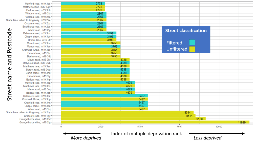 As we can see, there is no clear split between filtered and unfiltered roads. In fact the least deprived roads are the ones that would still be receiving through traffic.