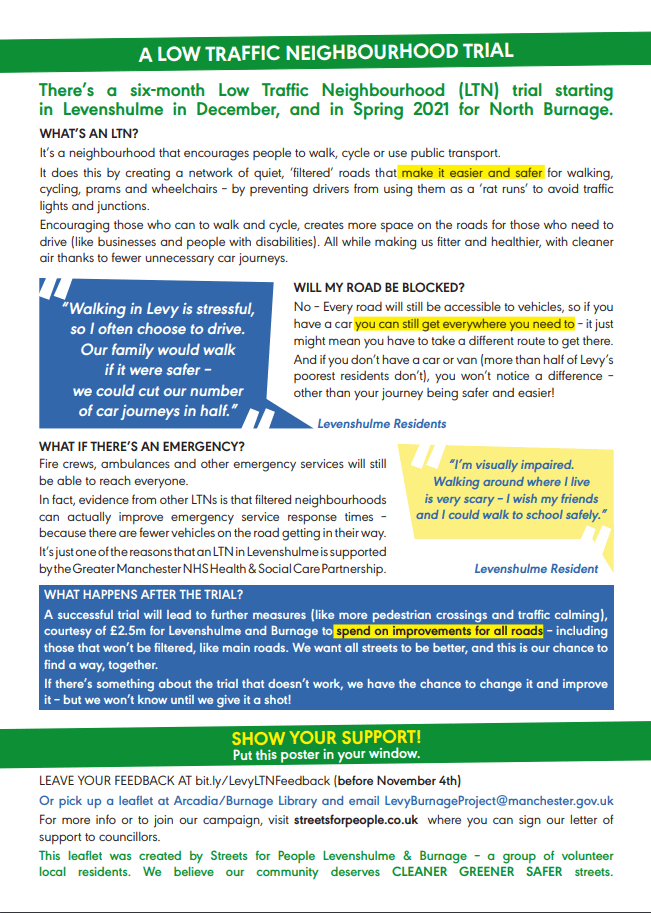 Streets for People, Levenshulme and Burnage are proud to unvail our new leaflet and poster, which we will post through every door in the low traffic neighbourhood trial area.