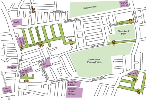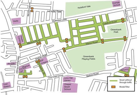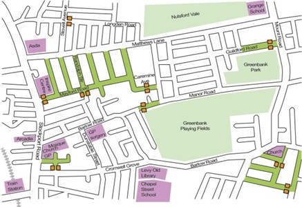 However, the final project consultation included a 20mph speed restriction, lane narrowing and speed tables for Matthews Lane (see Map 4, below). These interventions are very welcome on a road blighted by speeding. However, the plans include no speed reduction measures for Manor, Lonsdale, Hornbeam and Audley roads as well. So there is a great risk that these streets, without the western end of Manor Road filter, will see a marked increase in traffic moving at high speed, to avoid what will be a much slower Matthews Lane. In fact, these narrow residential roads could easily become the ‘main route’ for through traffic between the A6 and Mount Road for sat nav systems – a terrible situation for residents and anyone trying to move around the community without a car.