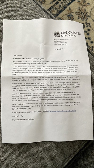 The letter states that the consultation found that the new location at the west end of Manor Road received ‘mostly positive’ feedback, meaning that they would install the filter in July.