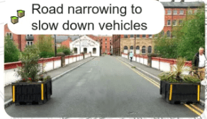 Temporary road narrowing can be done with the same planters being used for modal filters, as seen in this Leeds trial.