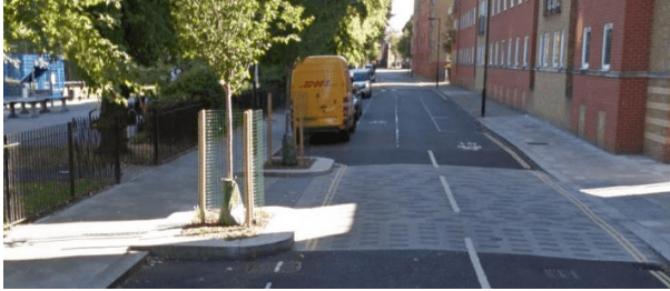Pavement widening can also be used using connected barriers as seen below, but gaps should be left to ensure people can still cross the road, as poor placement of these can actually restrict pedestrian movement, especially for those with mobility issues.
