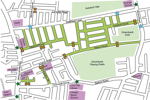 Not all main roads are equal, some, such as Broom Lane, Barlow Road and Cromwell Grove, have houses that face into the street and narrow roadways that exarcebate the effect traffic and its pollution has on these residents. Roads such as Albert Road and Slade Lane have houses set further back from the road, whilst the vast majority of houses on Matthews Lane do not face into the road itself, but are on the side streets adjacent to it. This has all been factored into our recommendations for action on boundary roads.