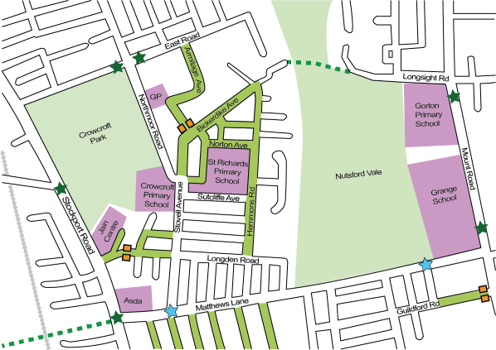 Kingsway/Slade lane runs along the western edge of the scheme, and has many key points that could benefit from easier crossing for both pedestrians and cyclists.